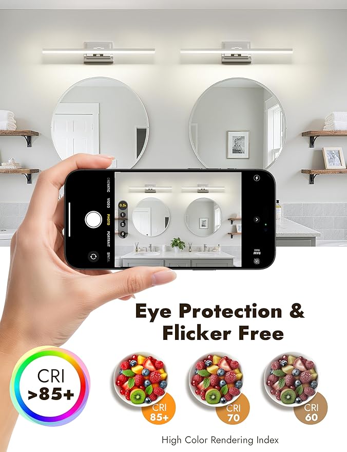 - 【5 CCT & Modern Design】This bathroom lighting fixtures over mirror offers five adjustable color temperatures(2700K/3000K/3500K/4000K/5000K), allowing you to choose the perfect lighting for any situation. The sleek, modern design of these bathroom lights complements any decor, adding a touch of elegance and functionality