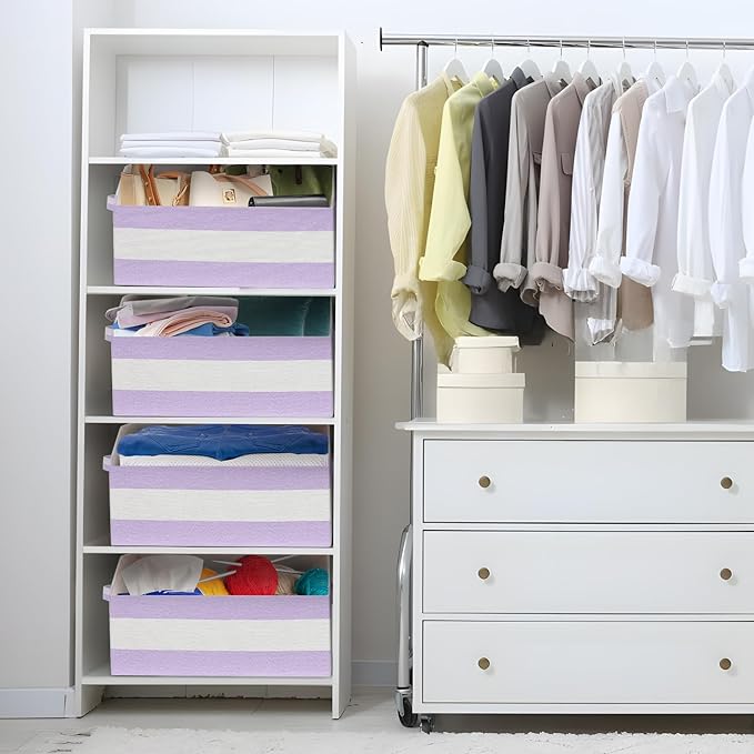 Linen Closet Organizers and Storage, Trapezoid Fabric Bins, Home Office Organization Baskets Striped Collapsible Box with Handles for Clothes, Blanket, Books, DVD, 4 Pack, Purple/White