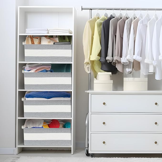 Linen Closet Organizers and Storage, Trapezoid Fabric Bins, Home Office Organization Baskets Striped Collapsible Box with Handles for Clothes, Blanket, Books, DVD, 4 Pack, Gray/White