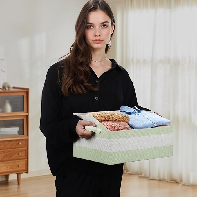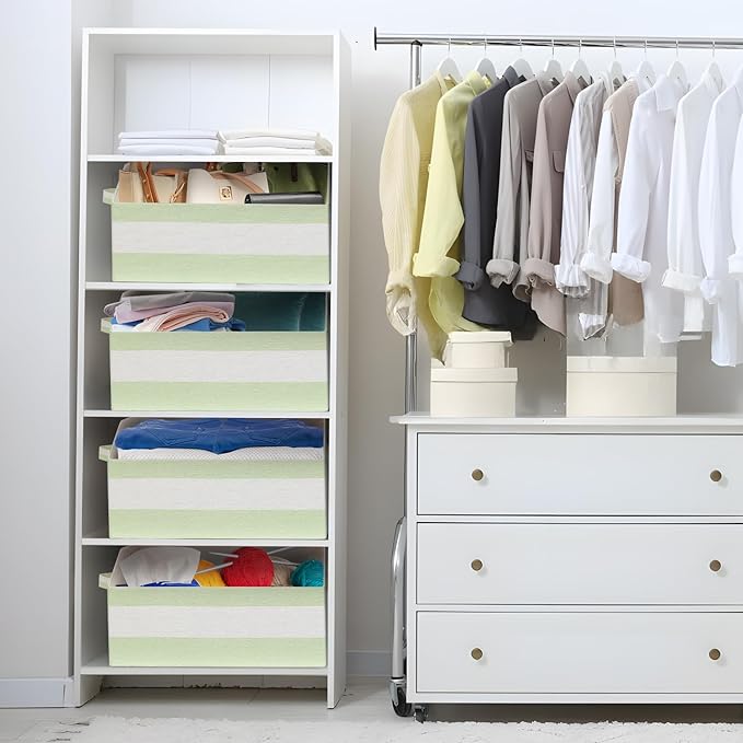 Linen Closet Organizers and Storage, Trapezoid Fabric Bins, Home Office Organization Baskets Striped Collapsible Box with Handles for Clothes, Blanket, Books, DVD, 4 Pack, Green/White