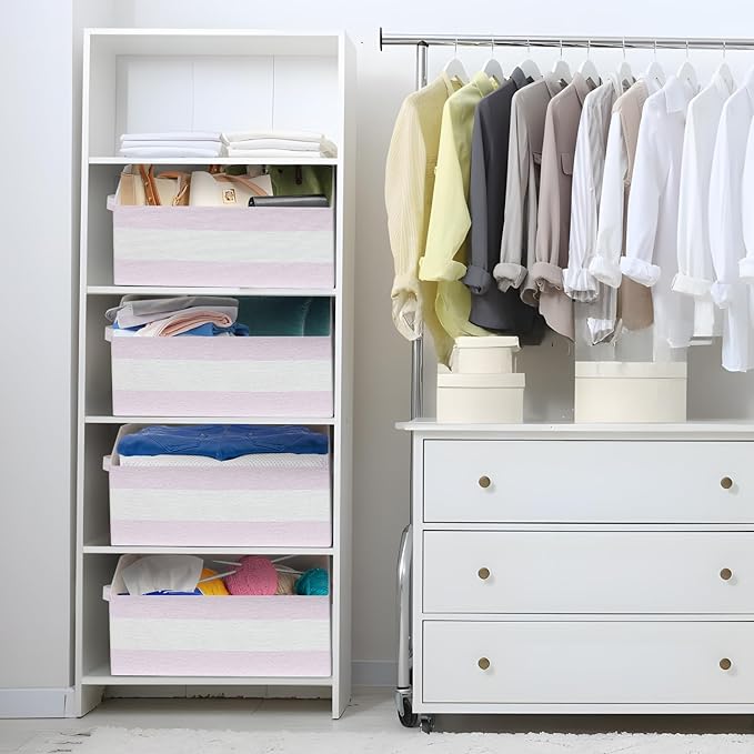 Linen Closet Organizers and Storage, Trapezoid Fabric Bins, Home Office Organization Baskets Striped Collapsible Box with Handles for Clothes, Blanket, Books, DVD, 4 Pack, Light Pink/White