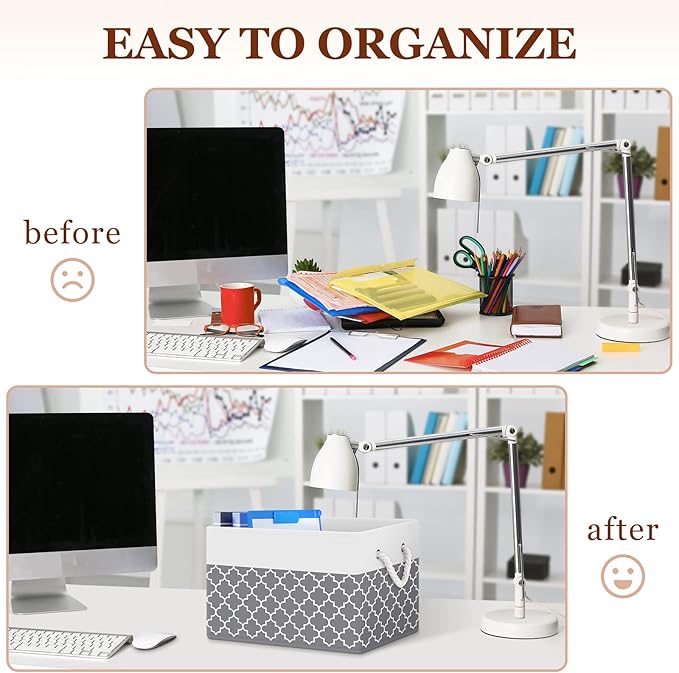 - Reinforced Handle: The bins for organization come with two sturdy rope handles made of soft rope to easily pull or lift the bin.; the organizer bin is stitched with a metal ring where the handle is connected to ensure durability and tear resistance