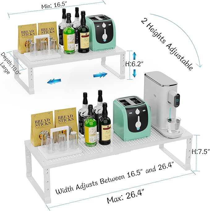 - ✅【Adjustable & Expandable Cabinet Shelf Organizer】 Customize your kitchen storage with our expandable metal shelving unit! Easily adjust the length from 16.5" to 26.4" to fit cabinets, countertops, or pantry spaces (dimensions: 16.5~26.4"W x 10.0"D x 6.2~7.5"H). Stack multiple units vertically to create a tiered storage solution for maximum space efficiency—perfect for plates, bowls, mugs, or canned goods.