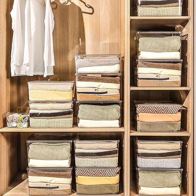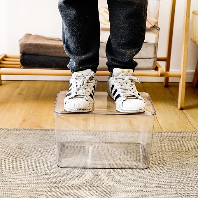 - 4. These large storage boxes with lids are perfect for sorting and storing clothes, food, shoes, toys, books, scarves, and more. Providing dust protection, the stackable design will fully utilize your closet or other space.