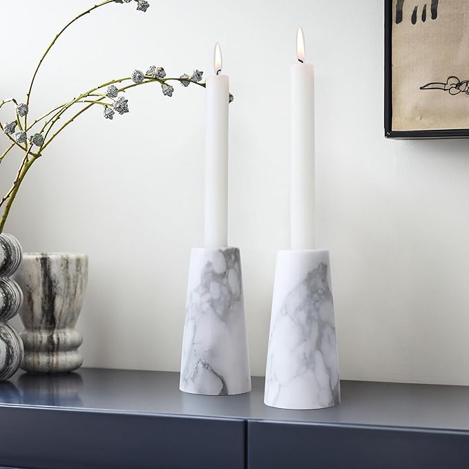 - Natural Material: Made of stunning marble, these candlestick holders add a touch of natural elegance to your home decor. A set includes 2 pieces marble candle holders (Size: 1.7*2.6*5.1''), designed for any standard 3/4" decorative candlestick or taper candles. which are the perfect combination of functionality and decoration.