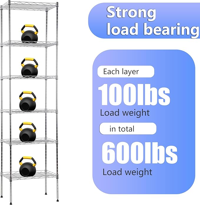BestOffice | 6-Tier Wire Storage Shelves | 17x12x64 | Chrome | with Adjustable Racks | Heavy-Duty Metal Shelf, Holds Upto 600 lbs | No-Tool Assembly | Ideal for Home & Garage Shelving