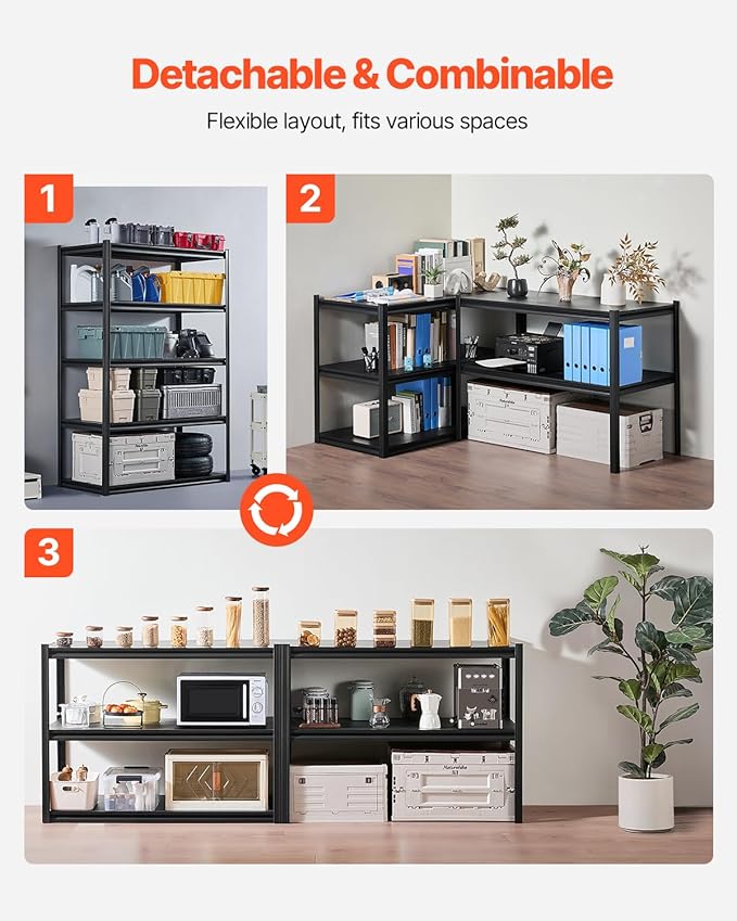 - Split Design: This garage shelving unit can be split into two separate racks for flexible use in spaces with height restrictions, such as under stairs, basements, or hallway corners.