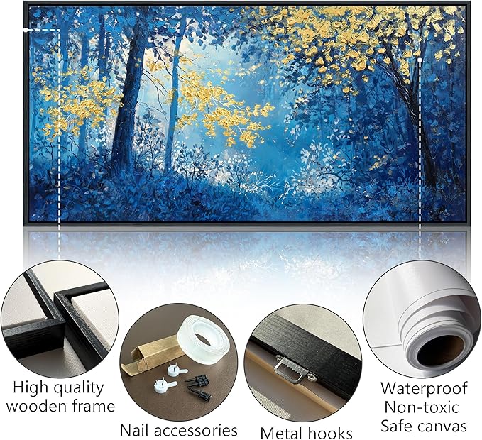 - Blue and Gold Canvas Wall Art Size:This 20×40 inches canvas wall art features a serene forest landscape with trees, blending blue and gold tones to create a modern yet timeless look for your living room, bedroom, or office.