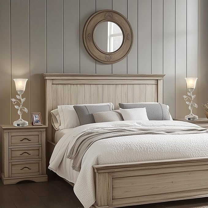 RORIANO Set of 2 Rustic Touch Table Lamps for Bedroom, 3-Way Dimmable Nightstand Flower Lamp with 2 USB Ports, Retro White Glass Shade Leaf Lamp for Living Room Entryway, 2 LED Bulb Included