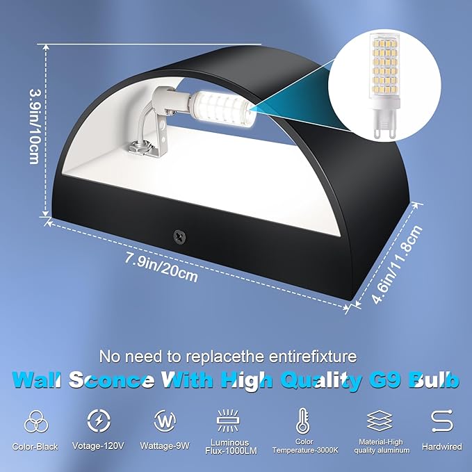 - ►【Replaceable G9 Bulb】:LED wall sconces indoor equipped with energy-saving and non flashing 9W G9 bulbs,The maximum power is 60w, and the black led wall sconces lampshade can be directly disassembled,The wall sconces interior is a replaceable G9 light bulb, which is low-power and environmentally friendly, saving you money.