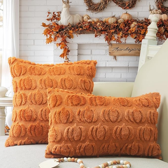 GEEORY Fall Pumpkins Soft Plush Pillow Covers, 12 x 20 Inch Set of 2, Fluffy Faux Fur Wool Decorative Farmhouse Cushion Case for Sofa Home Decoration Orange GC018-12