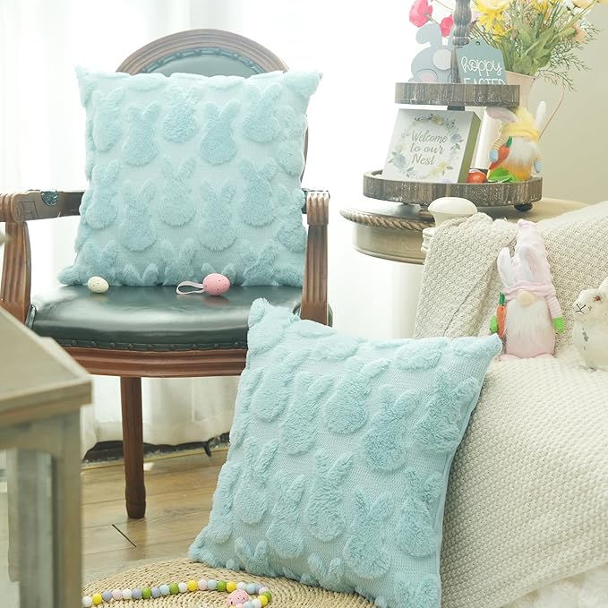 GEEORY Easter Bunny Soft Plush Pillow Covers, 18 x 18 Inch Set of 2, Fluffy Faux Fur Wool Decorative Farmhouse Cushion Case for Sofa Home Decoration Blue GC014-18