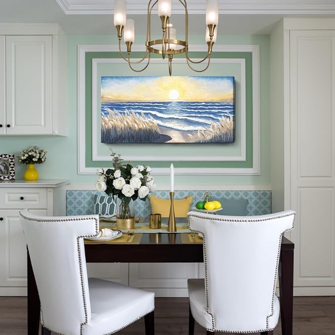 - Sunset Nature Landscape Painting:This ocean wall art add a touch of serene style to your space by filling an empty wall with a gorgeous, vivid sunset.The seascape canvas print features a shining gold sun over sea and seaside landscape with lapping waves,reeds swaying in the wind,rendered in shades of blue,yellow,orange,brown,gray and white.Bring the tranquility of the coast home with this beach wall art,this coastal bedrrom wall art is a breathtaking seascape painting