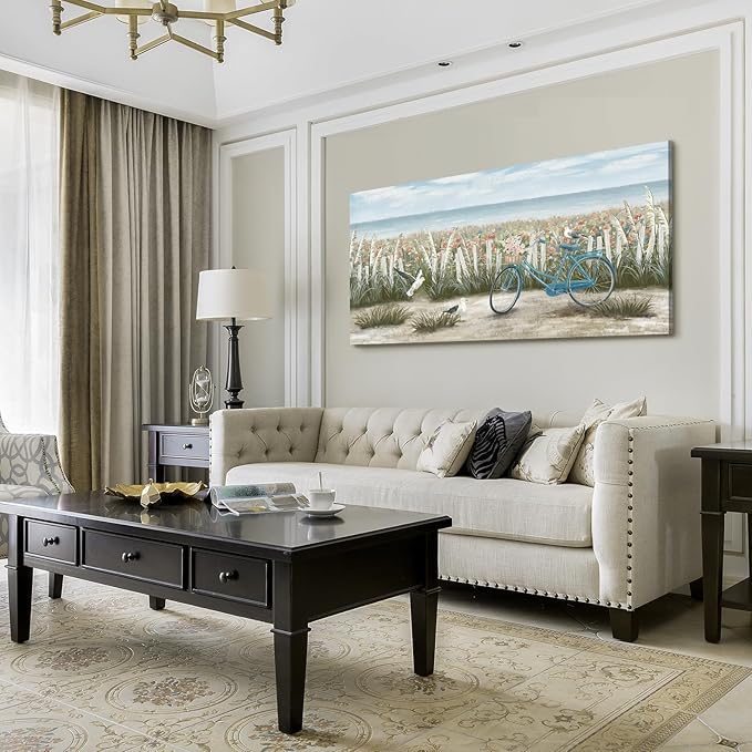 - Bring Ocean Vibe to Your Home:This beach wall art add a calming vibe to your coastal farmhouse space with a seaside landscape.The design features a seashore covered with colorful blooming wildflowers daisy and a blue old-fashioned bike with a basket chock full of pink flowers,the seagull perched on the coastline,the soft hues of blue,orange pink,white,gray and sand beige provide a soothing feel.This ocean wall art complements many casual home decor styles