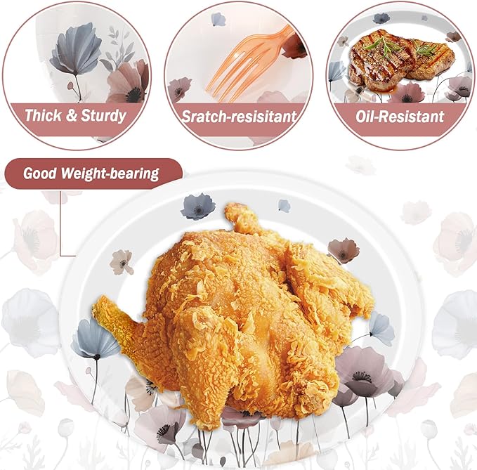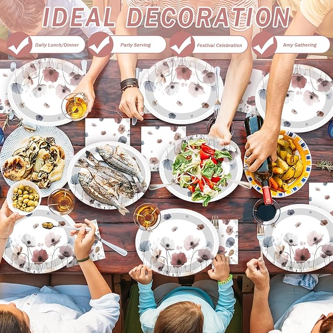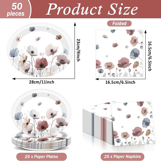 - Poppy Flower Party Supplies Set: Include 25 pcs brown poppy oval paper dinner plates (11.42x9.06inch) and 25 pcs 6.5inch watercolor floral leaf party napkins(unfold 13x13inch), large seasonal spring summer party paper plates hold more food, the poppy flower theme plates and napkins are featuring a delicate pattern, fit for gathering poppy theme party decoration.