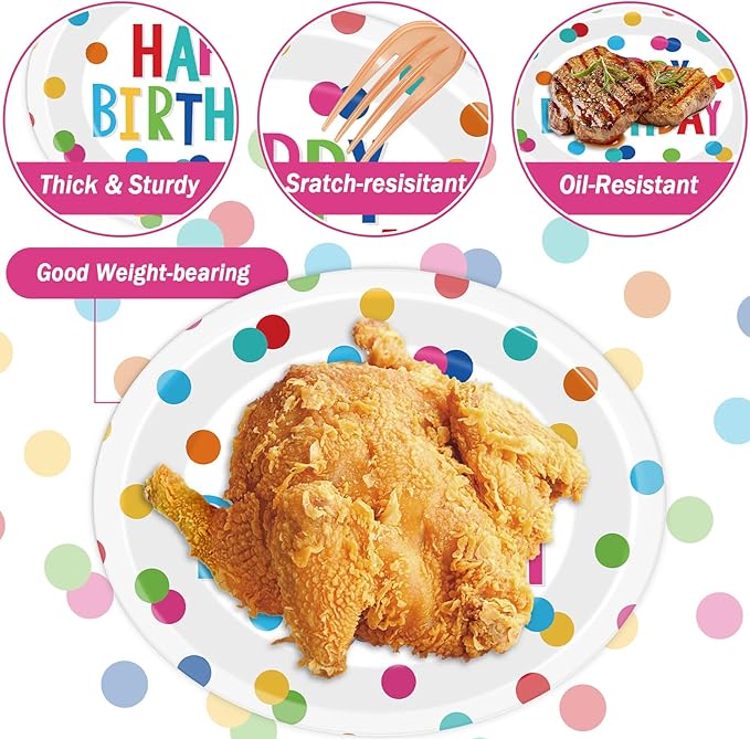 - 【High-quality Material】 Our large colorful dots birthday party platters are made of quality paper, no smell and well-printed, are disposable cutlery, and heavy duty confetti birthday party BBQ plates are waterproof and oil-resistant so the plates feel great to use. Happy birthday party napkins are soft and absorbent.