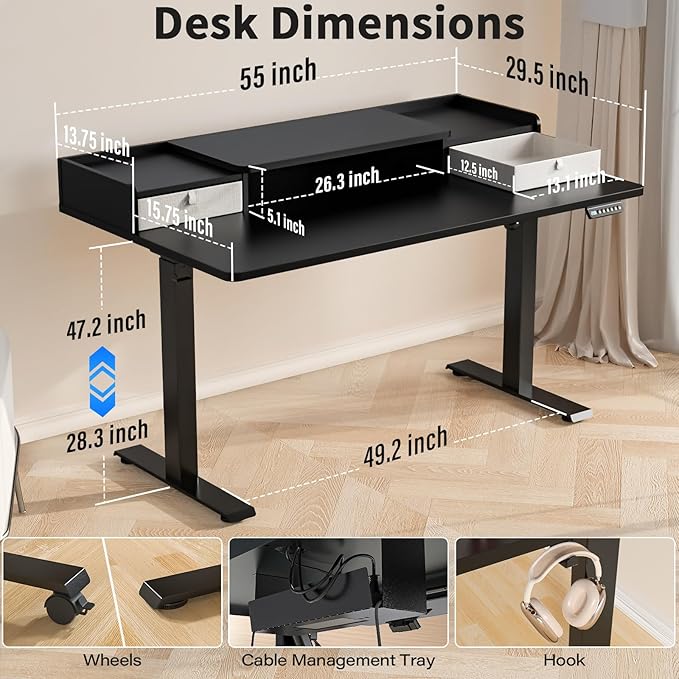 - Generous Storage: The spacious dual-drawer design provides ample storage for your essentials, helping you keep your workspace organized. A built-in cable management box at the bottom prevents cord tangling, while side hooks offer extra convenience for hanging accessories. Perfect for home office use, this thoughtful design keeps your desktop neat, tidy, and clutter-free.