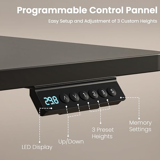 - Sturdy Performance: This electric standing desk is built with a high-strength carbon steel frame and a T-shaped stable structure, ensuring exceptional stability during height adjustments and providing reliable support for your ideal workspace setup. With a desktop weight capacity of up to 180 pounds and an adjustable height range from 28.3''-47.2'', you can conveniently save your preferred heights using three memory buttons and switch between them smoothly.
