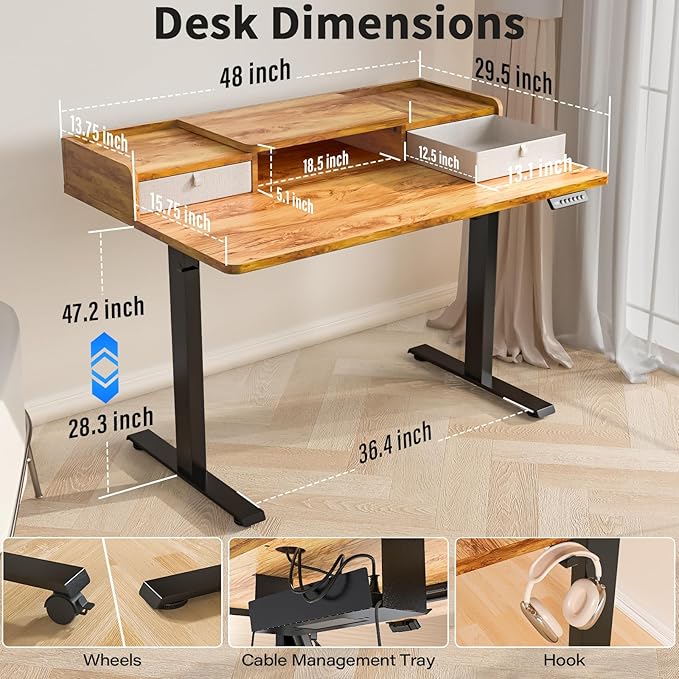 - Generous Storage: The spacious dual-drawer design provides ample storage for your essentials, helping you keep your workspace organized. A built-in cable management box at the bottom prevents cord tangling, while side hooks offer extra convenience for hanging accessories. Perfect for home office use, this thoughtful design keeps your desktop neat, tidy, and clutter-free.