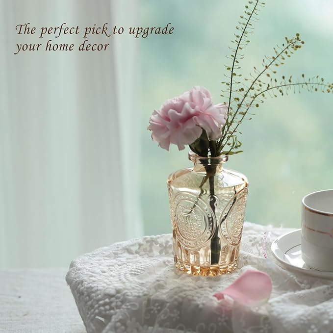 - Vintage Vase: You get 12 amber bud vases, each small glass vase is decorated with etched patterns to further enhance its attractiveness. These flower vases boast a vintage design, equally suited for elegant centerpieces and casual home decor, perfect for displaying on windowsills, dining tables, or wedding reception displays