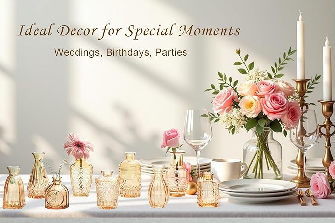 - Great Gift: This bud vases set of 12 makes a perfect gift for Anniversary, Birthdays, Weddings, Housewarmings, Thanksgiving, Christmas, or special occasions. These cute small glass bud vases will delight any flower lover or home decor enthusiast with their vintage appeal