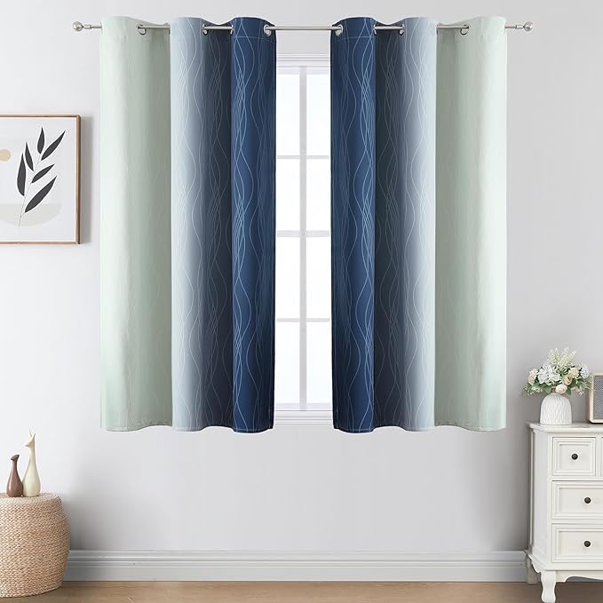 Estelar Textiler Sage Green and Navy Blue Ombre Blackout Curtains 45 Inches Long, Full Room Darkening Gradient Drapes for Kitchen, Thermal Insulated Grommet Curtains for Short Window,42Wx45L,2 Panels