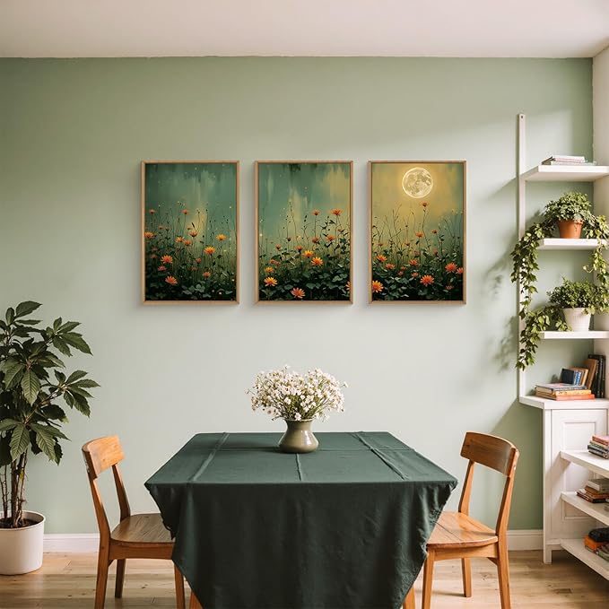 - 【Midnight Moonlit Wildflower Wall Art】This set of framed canvas wall art captures the serene beauty of a moonlit night, featuring vibrant orange wildflowers under a luminous full moon. The artwork's natural blossom theme and green night sky create a tranquil and enchanting atmosphere, perfect for adding a touch of nature's magic to your living space.