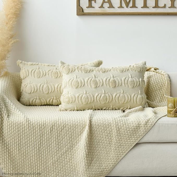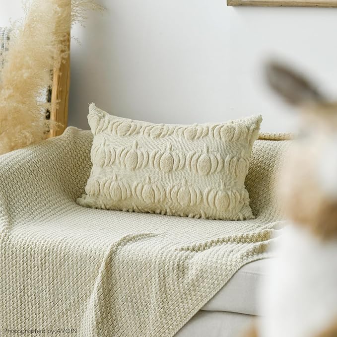 AVOIN colorlife Fall Pumpkin Beige Throw Pillow Covers, 12 x 20 Inch Seasonal Autumn Thanksgiving Harvest Decoration Soft Plush Faux Fur Jacquard Cushion Case Decoration for Sofa Couch Set of 2
