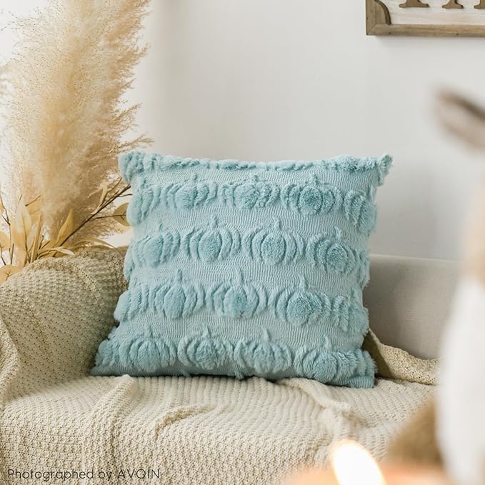 AVOIN colorlife Fall Pumpkin Blue Throw Pillow Covers, 18 x 18 Inch Seasonal Autumn Thanksgiving Harvest Decoration Soft Plush Faux Fur Jacquard Cushion Case Decoration for Sofa Couch Set of 2