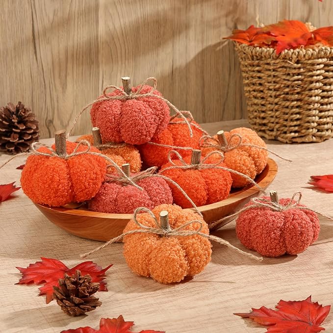 - 🎃【Cute and Unique Pumpkins for Decorating】All the mini pumpkins filled with cotton, having vivid wood stems cure and emerge from the top of the velvet pumpkins. The cute bow accent of the pumpkin decorations are the perfect finishing touch. These rustic yet traditional decorations feature three orange tones with a modern rustic design. Add some fun to your fall decorations for home, Halloween, Thanksgiving and harvest decor, make fall table decor more festive this season.