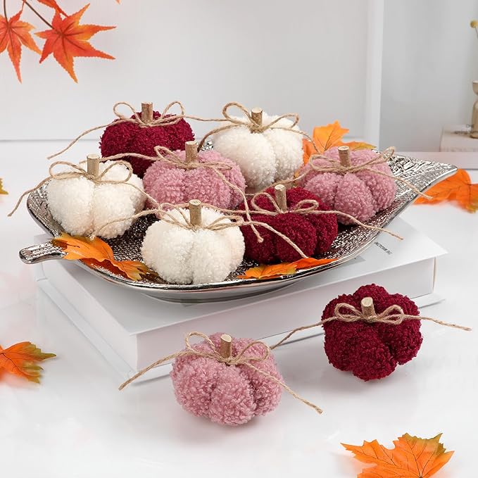 - 🎃【Cute and Unique Pumpkins for Decorating】All the mini pumpkins filled with cotton, having vivid wood stems cure and emerge from the top of the velvet pumpkins. The cute bow accent of the pumpkin decorations are the perfect finishing touch. These rustic yet traditional decorations feature pink, burgundy and cream with a modern rustic design. Add some fun to your fall decorations for home, Halloween, Thanksgiving and harvest decor, make fall table decor more festive this season.