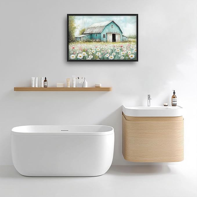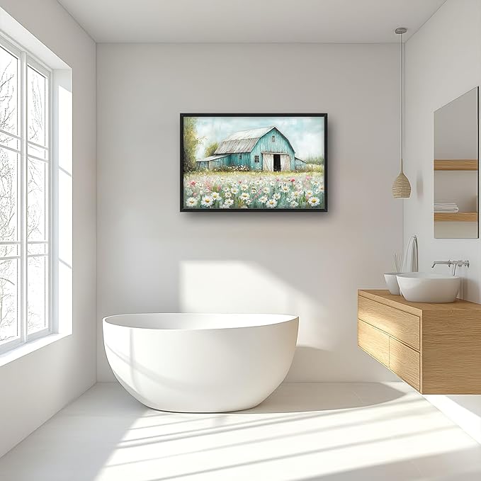 Farm Barn Large Wall Art for Living Room Framed, Farmhouse Wall Decor Pictures, Teal Barn Canvas Print Painting, Aesthetic Artwork Bedroom Office Home Decor 36"x24"