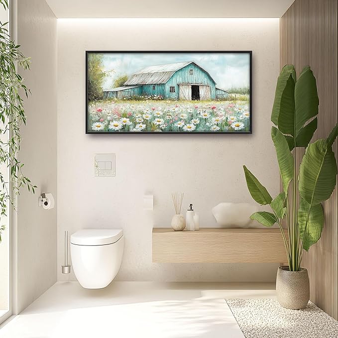 Farm Barn Large Wall Art for Living Room Framed, Farmhouse Wall Decor Pictures, Teal Barn Canvas Print Painting, Aesthetic Artwork Bedroom Office Home Decor 60"x30"