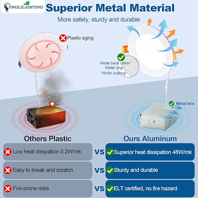 - 5.Safe, Easy Installation & Warranty: Crafted with heat-dissipating aluminum and certified by ETL/FCC, these 6-inch recessed lights are moisture-proof and fire-resistant. The spring-clip design ensures tool-free installation—just snap into place! Enjoy peace of mind with a 5-year warranty and 30-day returns.