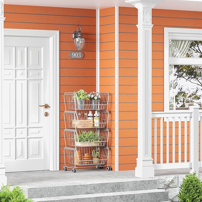 PUSDON 4-Tier Stackable Metal Storage Baskets, Anti-Rust Fruit Vegetable Rack, Dual Use Shelf for Kitchen, Home & Office, Silver Grey