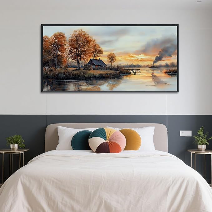 - Stunning Visual Appeal: Transform your wall art for living room with this serene sunset cottage scene. Warm orange/yellow hues and water reflections create a calming oasis. Ideal as large wall art centerpiece or wall art bedroom accent, blending nature's tranquility into any space