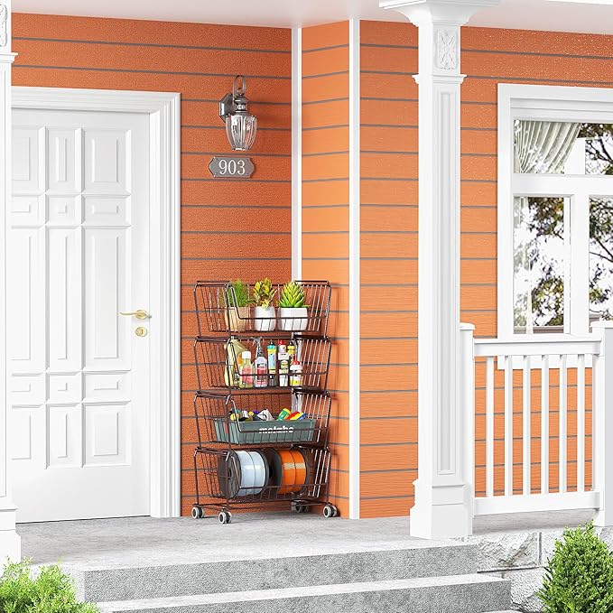 PUSDON 4-Tier Stackable Metal Storage Baskets, Anti-Rust Fruit Vegetable Rack, Dual Use Shelf for Kitchen, Home & Office, Bronze
