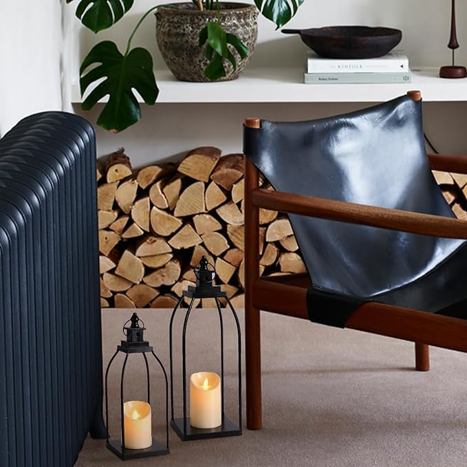 - Decorative Candle Lanterns Set -- You will get 2 modern farmhouse candle lanterns with 2 candles, one large lantern holder size is 5.5 x 5.5 x 17 inches, and a small lantern holder size is 4.7 x 4.7 x 14 inches. They are simple style, you can also add decorations around the candles for what you like and they look good on the side of the fireplace or front porch.