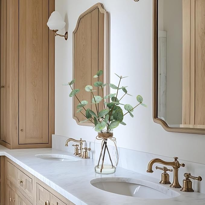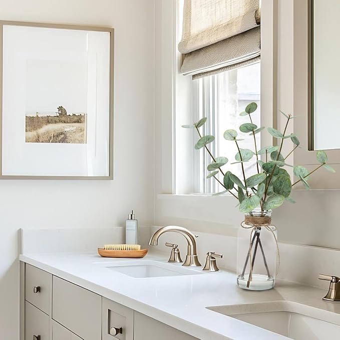 - 【Crystal-Clear Glass Vase with Faux Water】The eucalyptus stems are artfully arranged in a transparent glass vase, complete with faux water at the base for a convincing fresh-picked look. The combination of clarity and greenery adds sophistication to any modern or rustic setting.