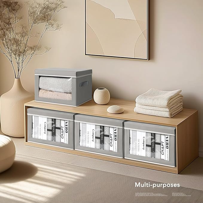 Storage Box with Lids - 7 Pack Fabric Clear Window Storage Bins, Decorative Bins with Handles, Large Foldable Organizer for Clothes, Towel, Blanket, Sheet, Grey