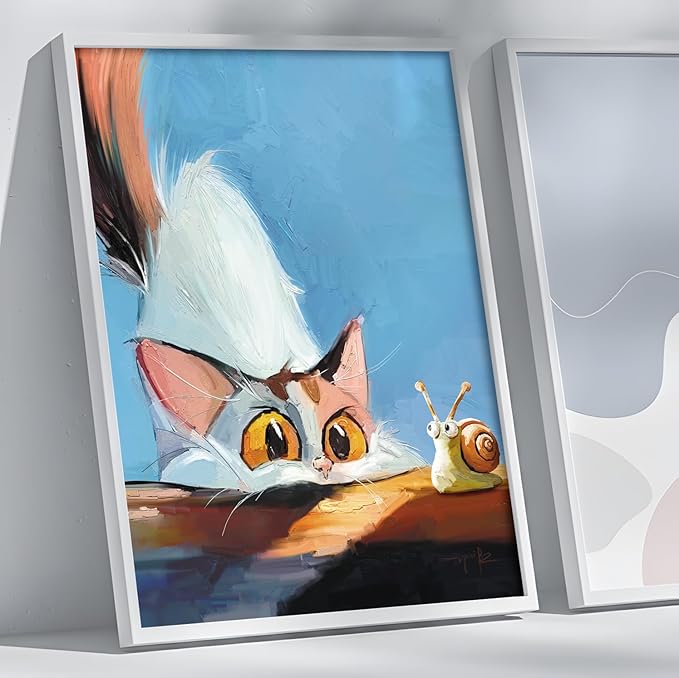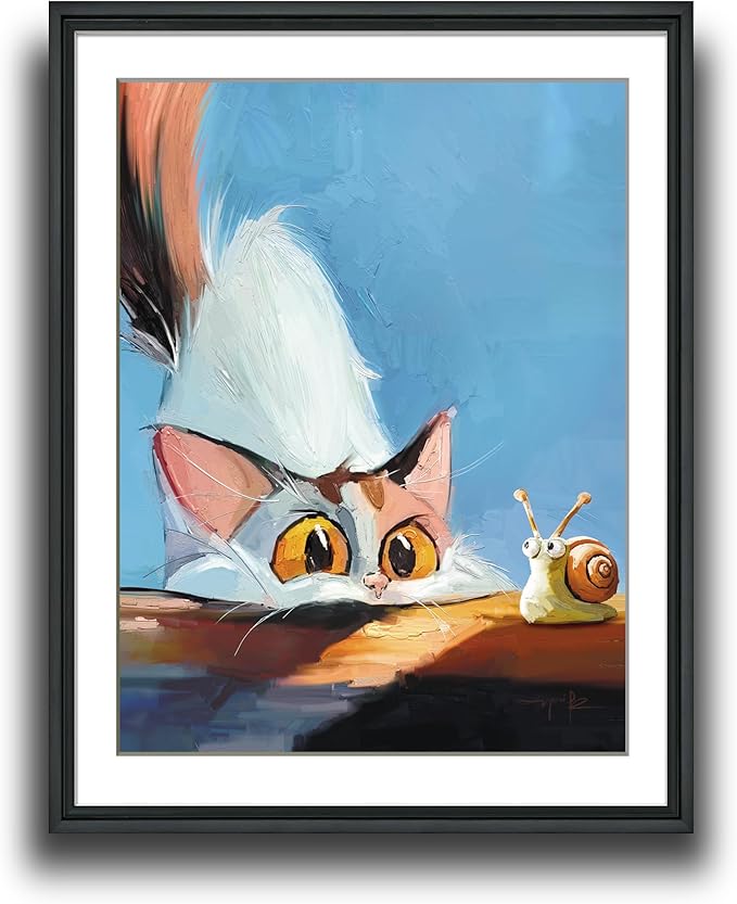 - Whimsical Cat and Snail Wall Art: This charming wall decor comes in 12x16 inches (30X40cm), framed and unframed.