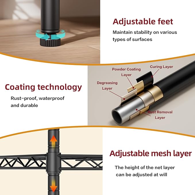 - Rustproof: This shelving has been specially coated to prevent rust or corrosion. You can rest assured to place it in your kitchen or bathroom shelves laundry room organization and storage