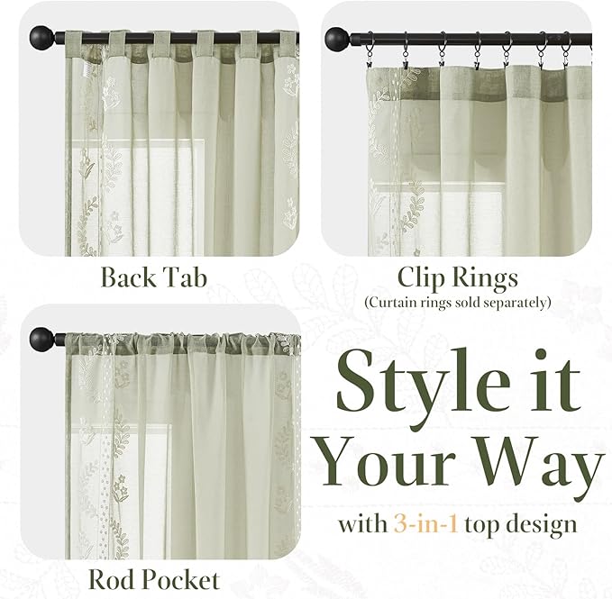 - Multiple Hanging Options: Rod pocket top allows for a modern touch while back tabs add an elegant flair. The 3-in-1 construction makes these curtains easy to slide through a curtain rod up to 1 1/2 inch diameter. You can pair them with blinds or other linen curtains for extra privacy