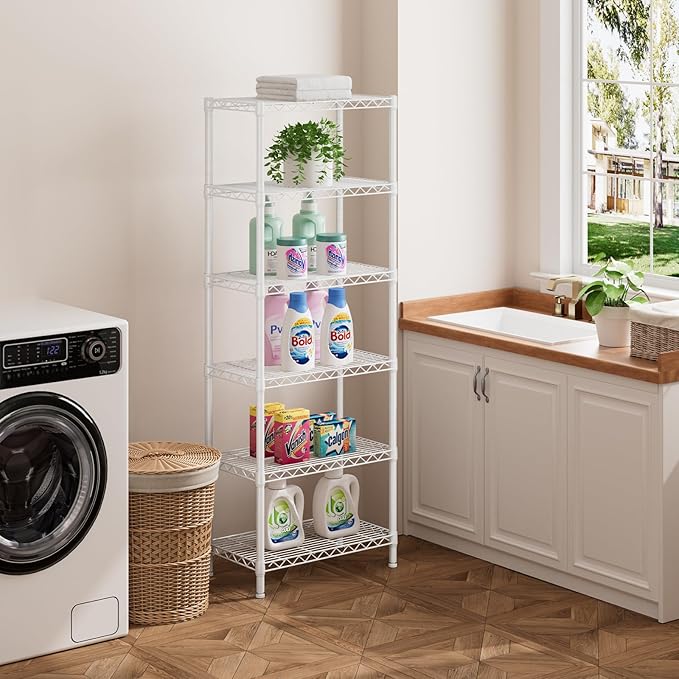 SINGAYE 6 Tier Shelf Adjustable Storage Wire Shelving Unit Metal Shelves Standing Closet Bathroom Organizers Pantry Kitchen Garage Laundry Room Organization Home Rack 12" D X 22" W X 69.5" H White