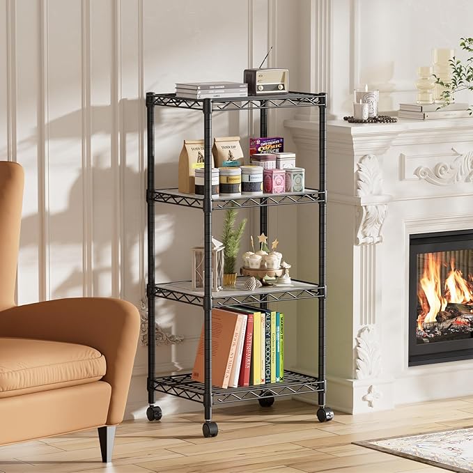 SINGAYE 4 Small Shelves Storage Shelf Wire Shelving Unit Metal Shelf Adjustable Organizers Storage Shelving with Wheels for Bathroom Laundry Room Kitchen Pantry11.5”D x 17.3”W x 44.5”H Black