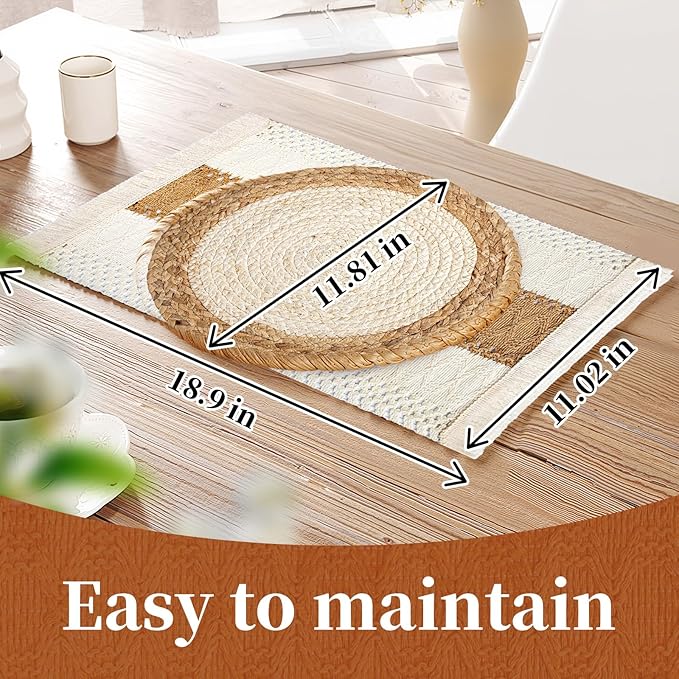 - 3. Versatile Table Décor: The square boho placemats measure 11.8"x17.7" and the round woven placemats are 11.8" in diameter. Impress your loved ones and guests with high-quality, exotic placemats. The color of these mats are natural, contain no chemicals, and fit with most of the wood table colors. They can be used to celebrate birthday, wedding, party, Easter, Christmas,New Year, housewarming, graduation, etc