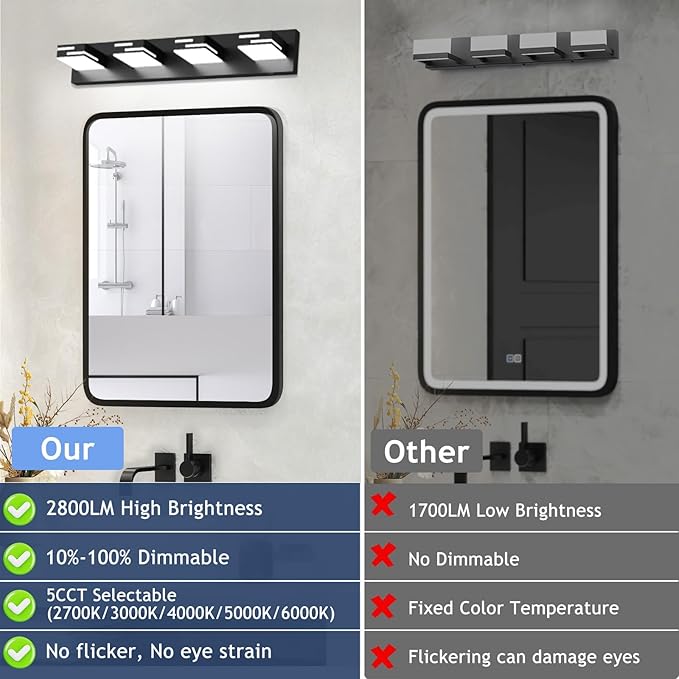 - 【High Brightness】 32W LED vanity lights for bathroom, emitting 2800 lumens of bright, flicker-free light. Provides brighter illumination than traditional 140W bulbs, perfect for makeup, grooming, and detailed tasks. The frosted acrylic lampshade evenly diffuses the light, offering clear, comfortable illumination while protecting your eyes from strain