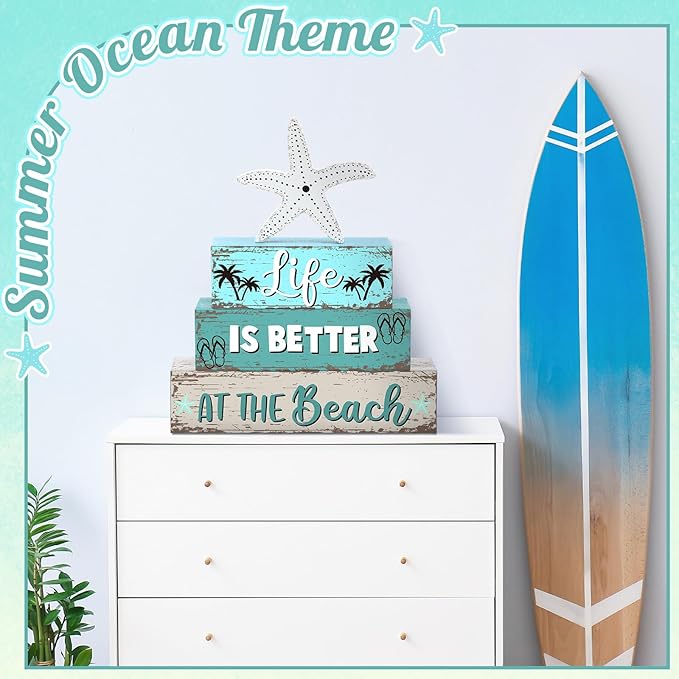 Geelin 4 Pcs Summer Table Decorations Ocean Life Better Wooden Block Signs Beach Theme Starfish Palm Slipper Tabletop Centerpieces Farmhouse Tiered Tray Decor for Home Table Kitchen Shelf