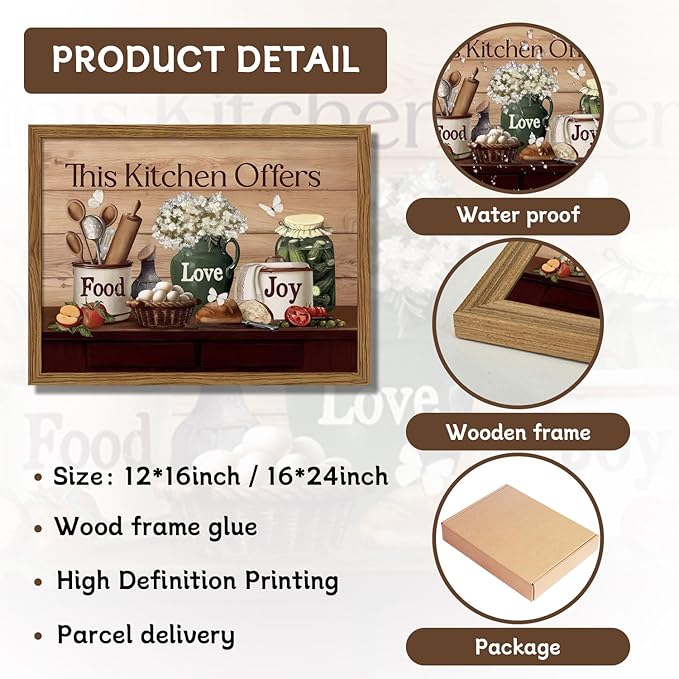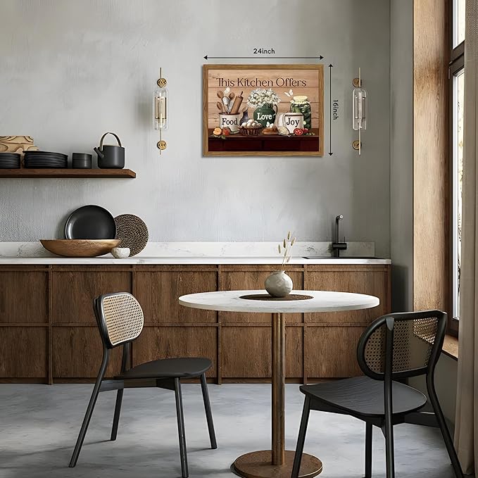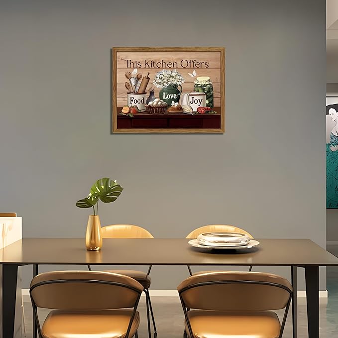 - 【Country Kitchen Wall Art 】Infuse your kitchen or dining space with warmth and personality with this vintage-inspired kitchen wall decor. Featuring the phrase “This Kitchen Offers Food, Love, and Joy,” each 16x24 inch wood-framed canvas print blends rustic charm with a welcoming message, making it the perfect accent for any country kitchen or modern farmhouse setting.
