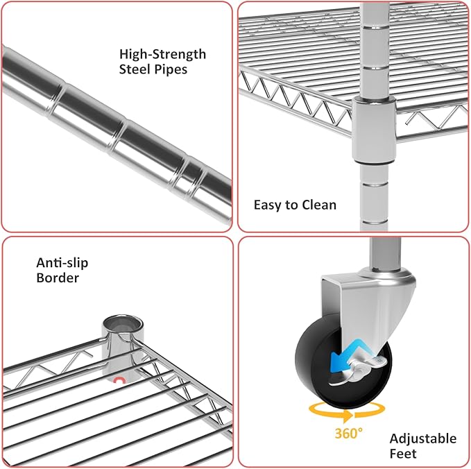 - 【Adjustable Feet and Convenient Wheels】The wire shelving with wheels comes with 4 sturdy 360 degree rollers, two of which can be locked, so you can push the storage shelves with wheels to where you need it, anytime, anywhere, and keep it in place. The adjustable leveling feet can keep the metal shelves in a fixed position, so that the device can maintain balance and stability, and solve the problem of uneven ground.